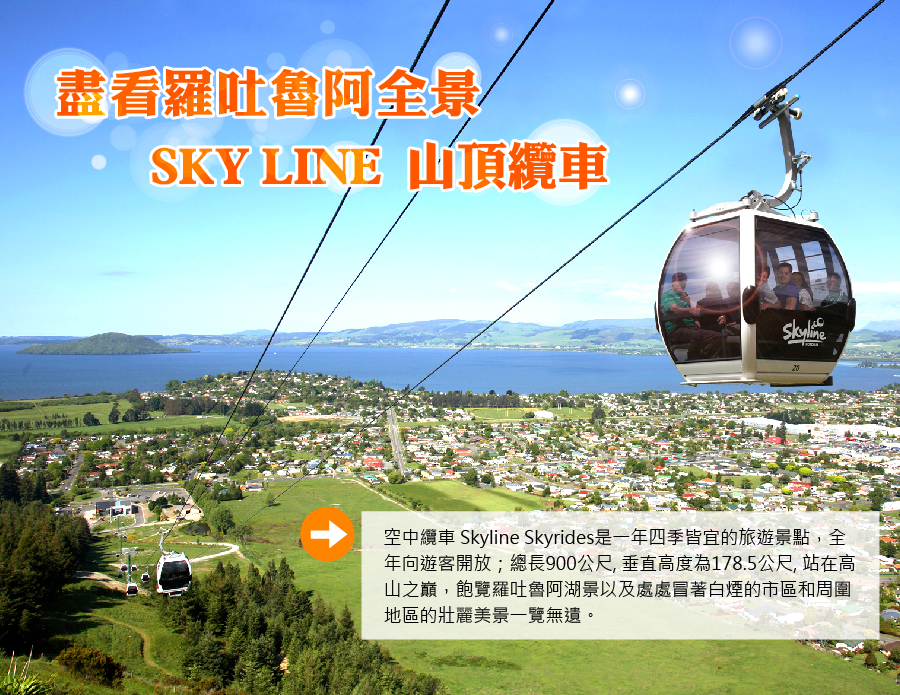 天際纜車於山頂遠眺羅吐魯阿湖景以及處處冒著白煙的市區,並於Skyline山頂景觀餐廳享用Kiwi自助午餐。