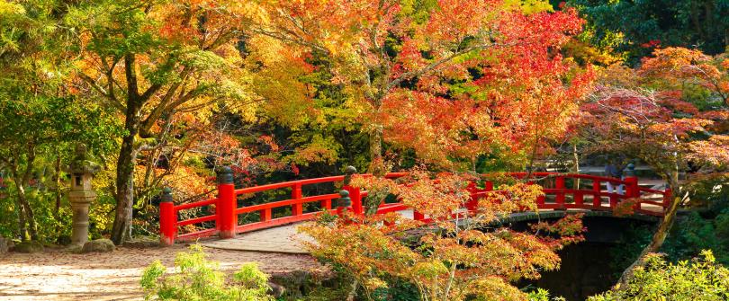 位於國家指定天然紀念物的彌山原始林地的山麓地帶。每到秋季,園內約700株紅葉樹一齊染上赤豔的色彩,十分壯觀。擁有秋天熾熱的紅葉之美。 春天櫻花盛開後,夏天被清新的綠色包圍,是宮島一年四季的主要景點之一。
