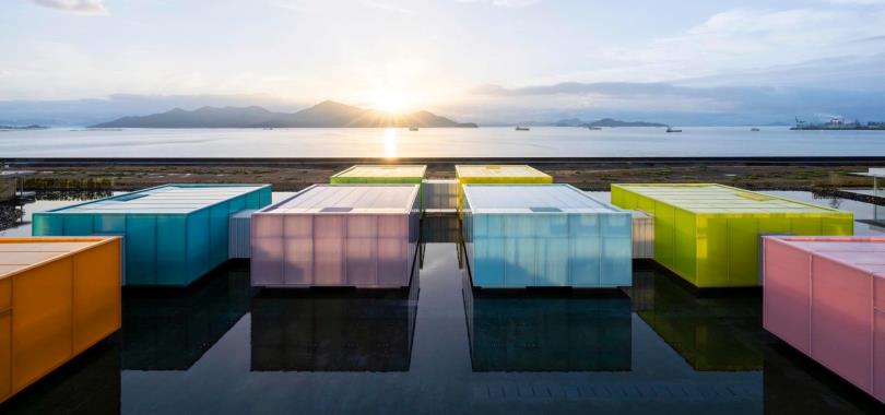 這座能一望宮島的海邊建築出自建築師坂茂之手,2024年更被凡爾賽獎評選為「全球最美的美術館」之一。 其中最吸睛的,是靈感來自瀨戶內海群島的可動展廳。 水池上羅列著8間展廳,外牆覆上不同色調的彩色玻璃。