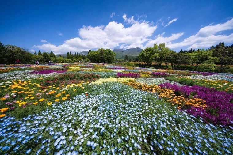 【久住花公園】大分縣竹田市九重花卉公園位於阿蘇國立公園內的九重台地。這裡是一座一年四季皆可以欣賞美麗自然風光的花卉公園,以日本百座名山之一的九重山脈和遠處的阿蘇五峰為背景,可以欣賞到500種,500萬株各色鮮花!