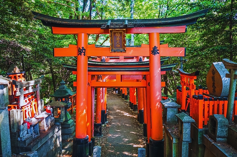 【伏見稻荷大社】據史書記載建於和同4(公元711)年,是日本全國各地四萬所稻荷神社的總社。稻荷神社主要是日本人信奉的保佑商業繁榮昌盛、五谷豐收之神的所在地。 伏見稻荷大社位於稻荷山,由樓門、本殿、千本鳥居等構成,綠樹掩映深處,一條看似隧道、由千座朱紅色鳥居構成的神祕通道最讓人印象深刻,直通稻荷山山頂,是京都獨特風景的代表之一。每年舉行歲旦祭、稻荷祭、節分祭、田植祭等多種祭祀活動。